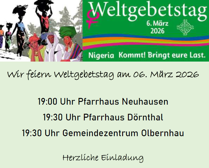 Herzliche Einladung zum Weltgebetstag am Fr., 6. März 2026 an 3 verschiedenen Orten